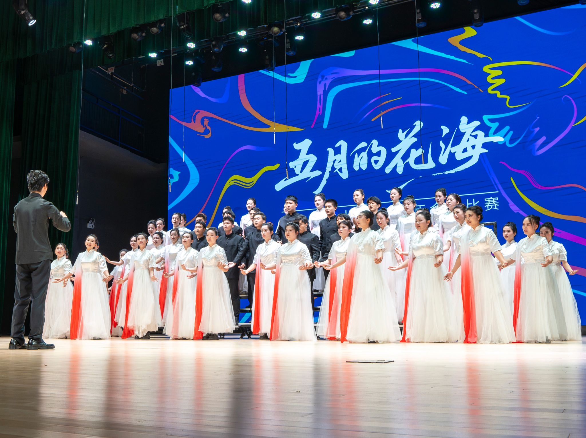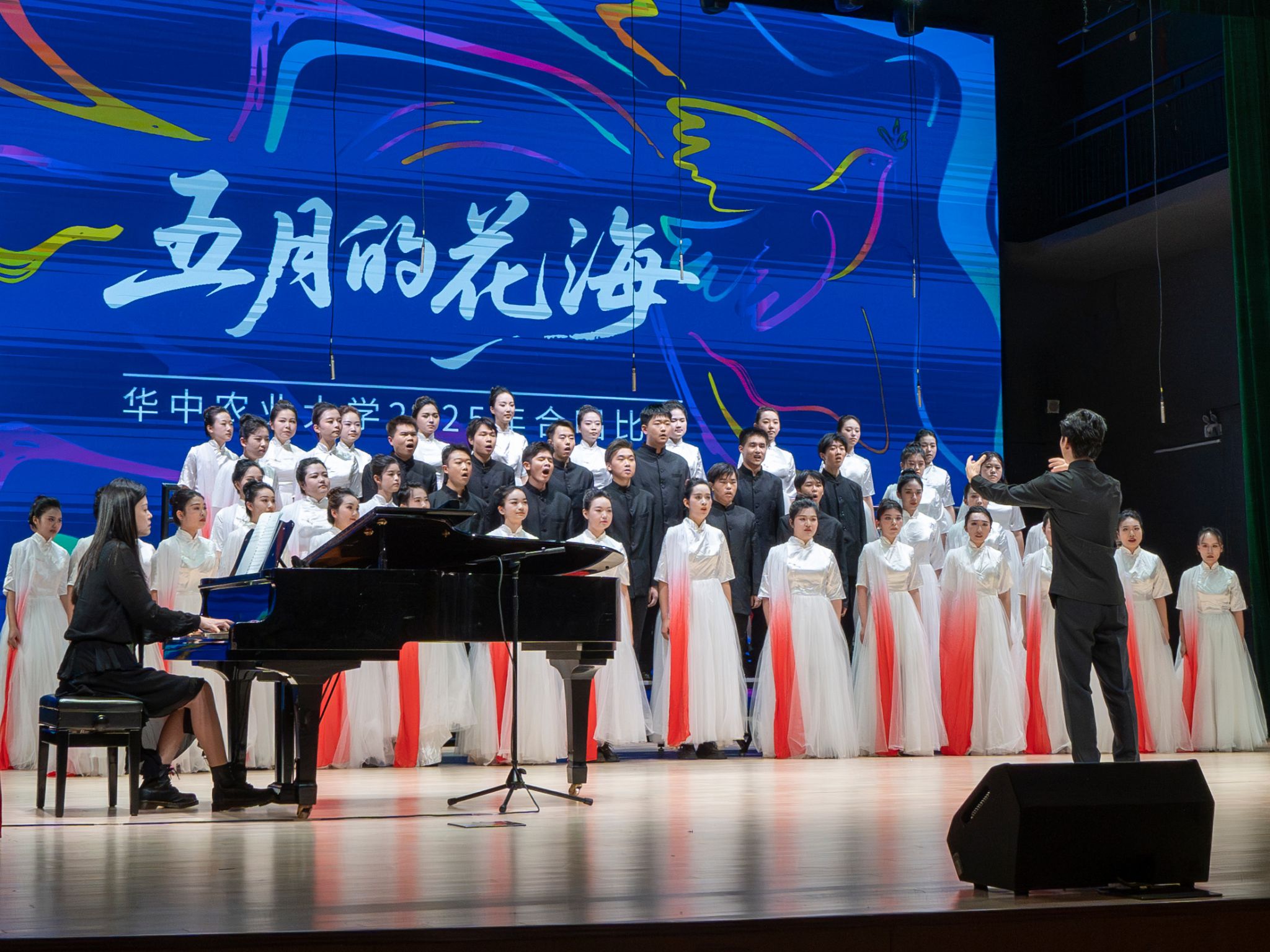 随后,“五月的花海”合唱比赛正式开始。来自15个学院的合唱团和我校小宇宙合唱团共同唱响音乐的华章。