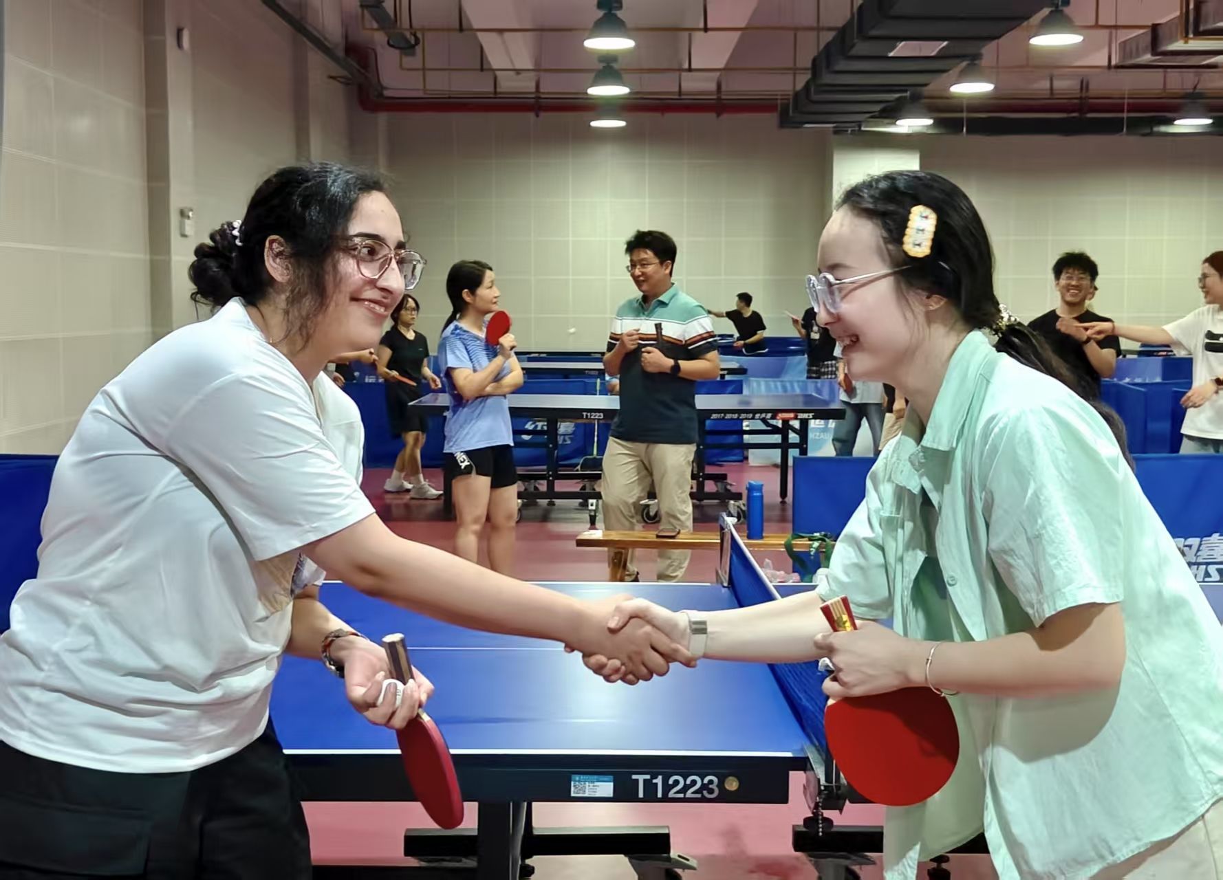 比赛中,于子润担任记分员。王战队和金战队双方成员你来我往,双方选手接连上场,最终金战队选手凭借精湛的球技获胜。每局比赛结束后,选手们都友好地握手合影留念,展现了良好的体育精神和团队友谊。