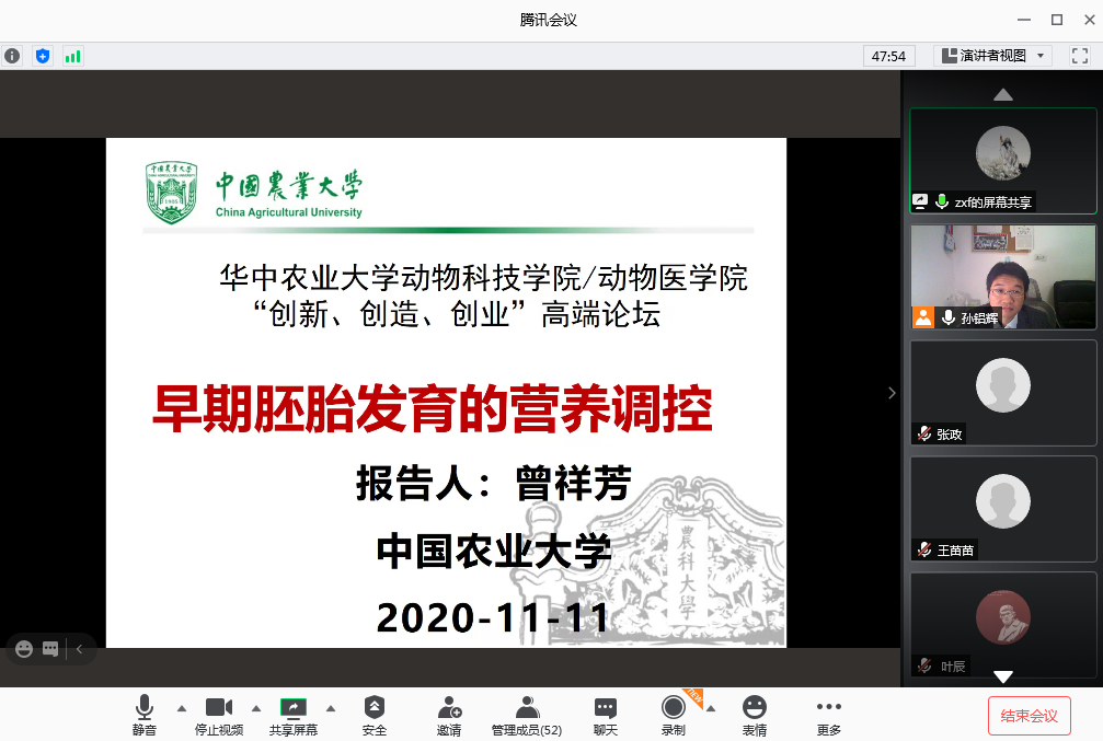(通讯员褚小寒)11月11日上午,中国农业大学曾祥芳副教授应邀做客动科动医学院“创新、创造、创业”高端论坛,带来了题为“早期胚胎发育的营养调控”的学术报告。校内外80余名师生线上参加了此次学术报告会。报告会由动科动医学院孙铝辉教授主持。