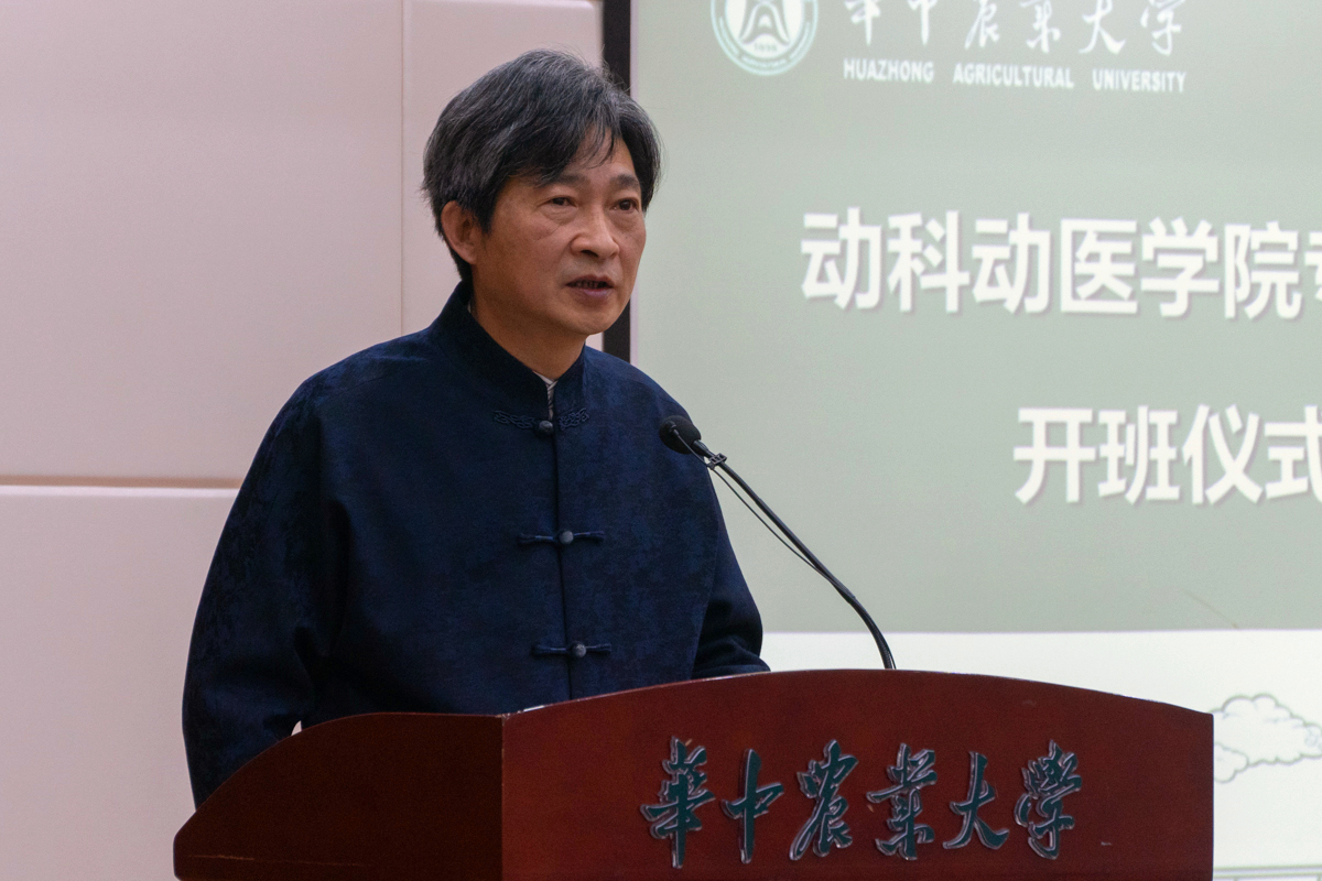 高翅在讲话中表示,一代人有一代人的使命与担当,一代人有一代人的奋斗与奉献,当前我国畜牧兽医行业与世界先进水平相比仍有一定差距,需要同学们清醒认识、努力学习,在未来承担起重要使命,打好翻身仗,实现科技的自立自强。他强调,专业学位硕士人才培养改革班的同学们应当明确认识、提高站位,从人类健康安全的宏观角度重新构建职业定位和个人认知。随着人类社会高速发展,破坏自然生态无形中加剧了人畜共患病的发生,一方面威胁到以肉蛋奶为代表的食物安全,另一方面直接威胁到人类健康,因此保障动物健康,促进人与自然和谐共生俨然成为守护人类生命健康安全的重中之重,高级临床兽医人才班、生态与智慧养殖人才班的开设对守护人类生命健康安全大有裨益,也为不确定的未来做好了充分准备。他以董必武先生题词“民生在勤,勤则不匮;性习于俭,俭以养廉”与师生共勉,勉励人才培养改革班同学们志存高远、勤奋学习,以过硬政治素养和扎实知识技能迎接新时代的挑战。