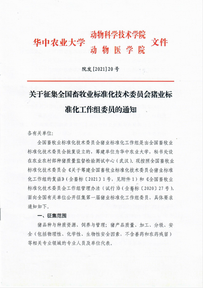 关于征集全国畜牧业标准化技术委员会猪业标准化工作组委员的通知