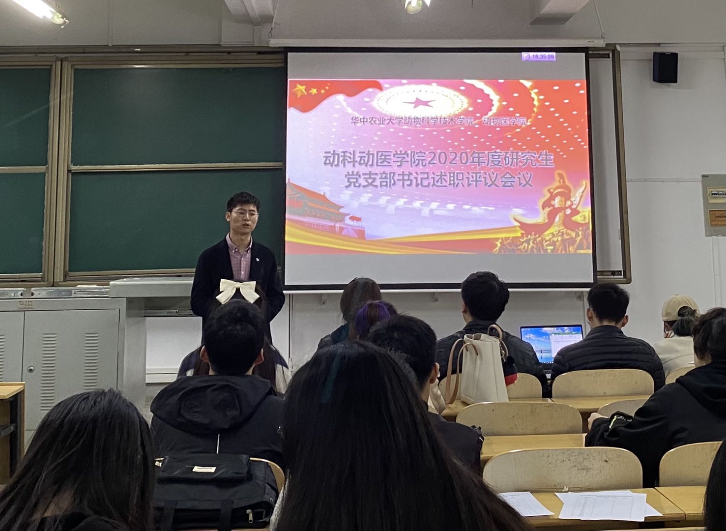 (通讯员 孙晓露 供图 代小童)2021年4月1日下午六点半,我院于二教403召开了动科动医学院2020年度研究生党支部书记述职评议会议,会议由党建办主任喻正旺主持,院辅导员高宏铭老师、全体支部书记及党建办成员参加此次会议,来自动物营养与饲料学、动物遗传育种与繁殖学、预防兽医学、基础兽医学、临床兽医学及人才改革班的30个研究生党支部参与本次支部书记述职评议考核。