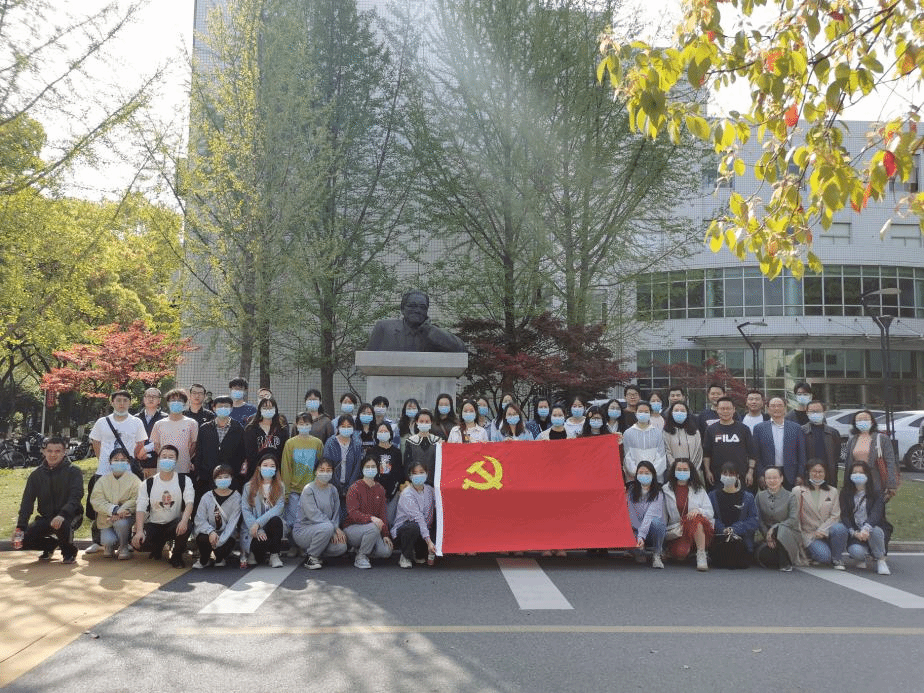 (图为兽医公共卫生系教职工与学生党员在陈华癸先生塑像前合影)