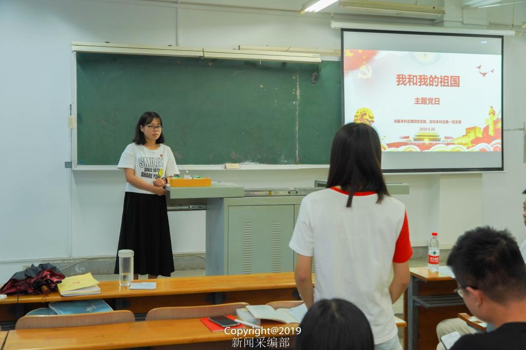 (通讯员 高宁 摄影 童景轩)9月26日下午,动科动医学院以“我和我的祖国”为题的主题党日交流活动在二教202顺利举行,参与本次会议的还有临床兽医系教授郭定忠、辅导员刘德志,以及来自动医本科生第四党支部和动科本科生第一党支部的同志们,本次交流活动由动医第四党支部书记刘洁洁主持。