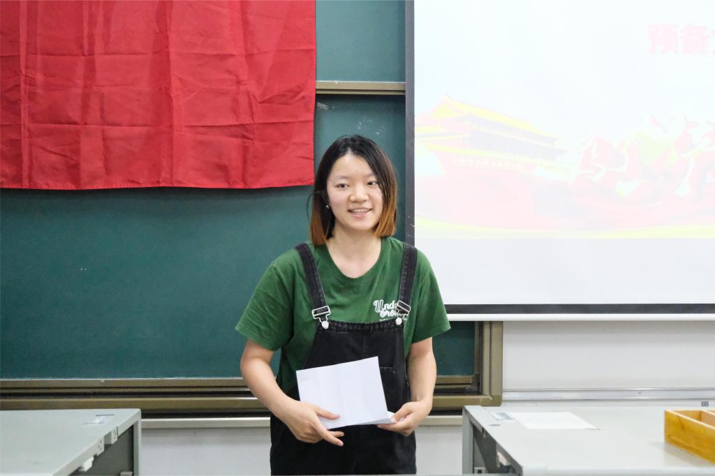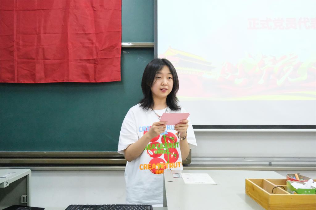 预备党员代表黄思雨上台致辞。她表示自己在丰富的实践活动中真正地实现了为同学服务的愿望,也呼吁新转正的党员多多参加实践活动,将实践与理论知识结合起来。