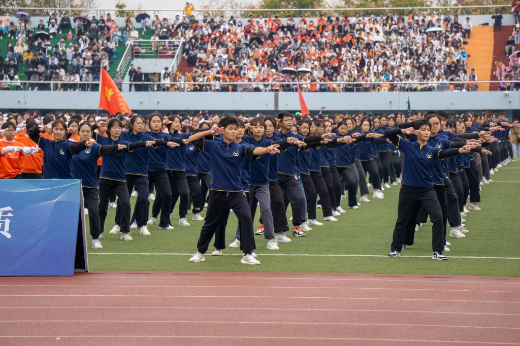 鼓声强劲有力,八只醒狮威风凛凛、活灵活现,精彩的表演赢得了在场观众热烈的掌声。运动会开幕式在全场观众的欢呼声中拉开了序幕。紧接着,由14个学院一千六百八十名广播操队员带来的第九套广播体操表演开始了。秋雨如绵,动科动医学院队员身着藏青色短袖院服,动作整齐划一,活力满满。灿烂的笑容是他们对未来的期待和憧憬,也展现着狮山学子蓬勃而又激情的热血青春。