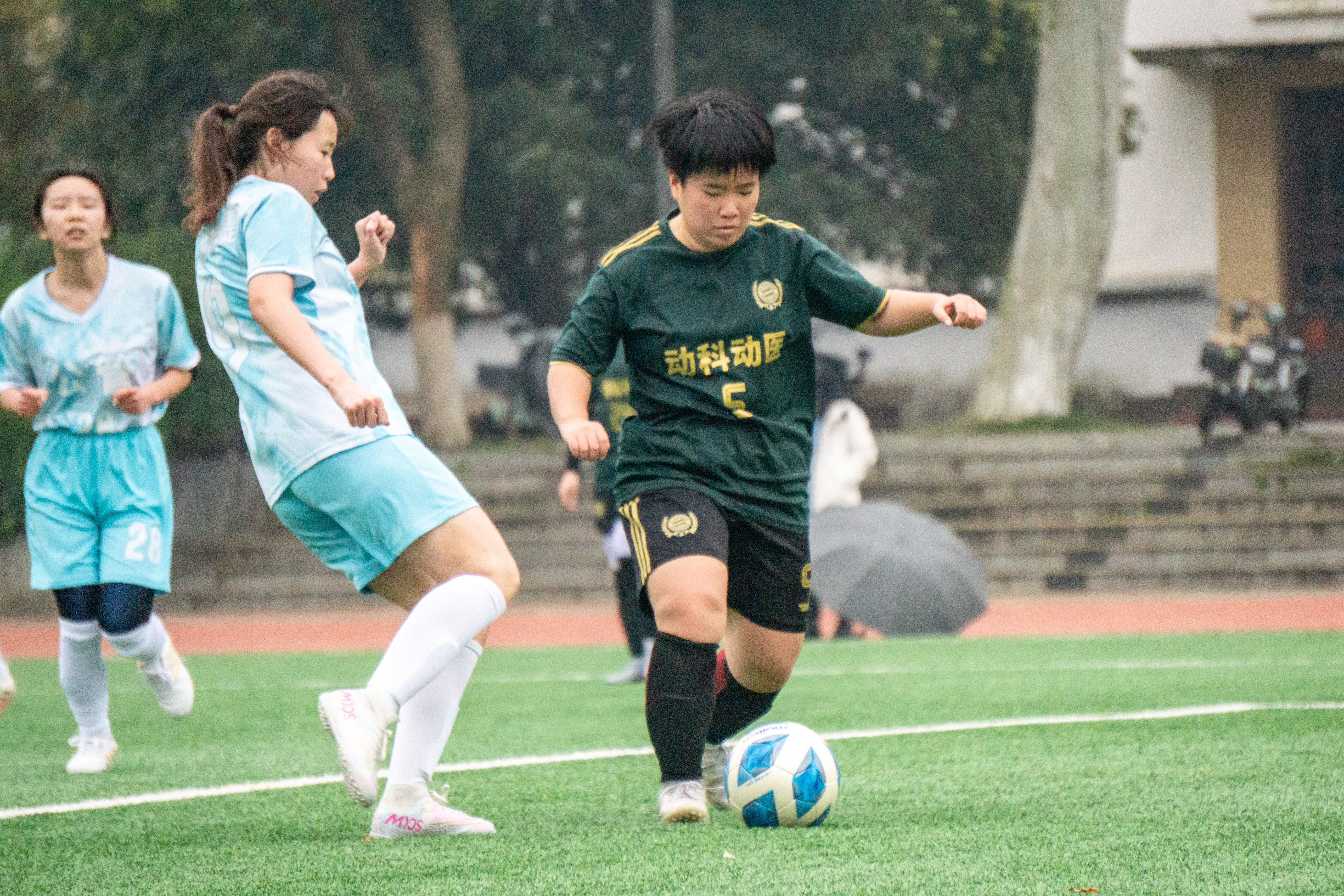 下半场中,淅淅沥沥的小雨并未浇灭场上球员的斗志,反而将比赛推向另一个高潮。比赛开始后,动科动医队根据上半场战况进行了战术调整,多次通过传导球寻找射门机会。公管队也迅速调整状态,掌握了比赛的主动权,拿下本场比赛第一分。但动科动医女足并未因此而萎靡不振,反而迅速重振旗鼓、组织反击。在比赛的最后六分钟,动科动医队利用公管队弱势进行猛攻,并成功进球、扳平比分,将本场比赛拖入点球大战。